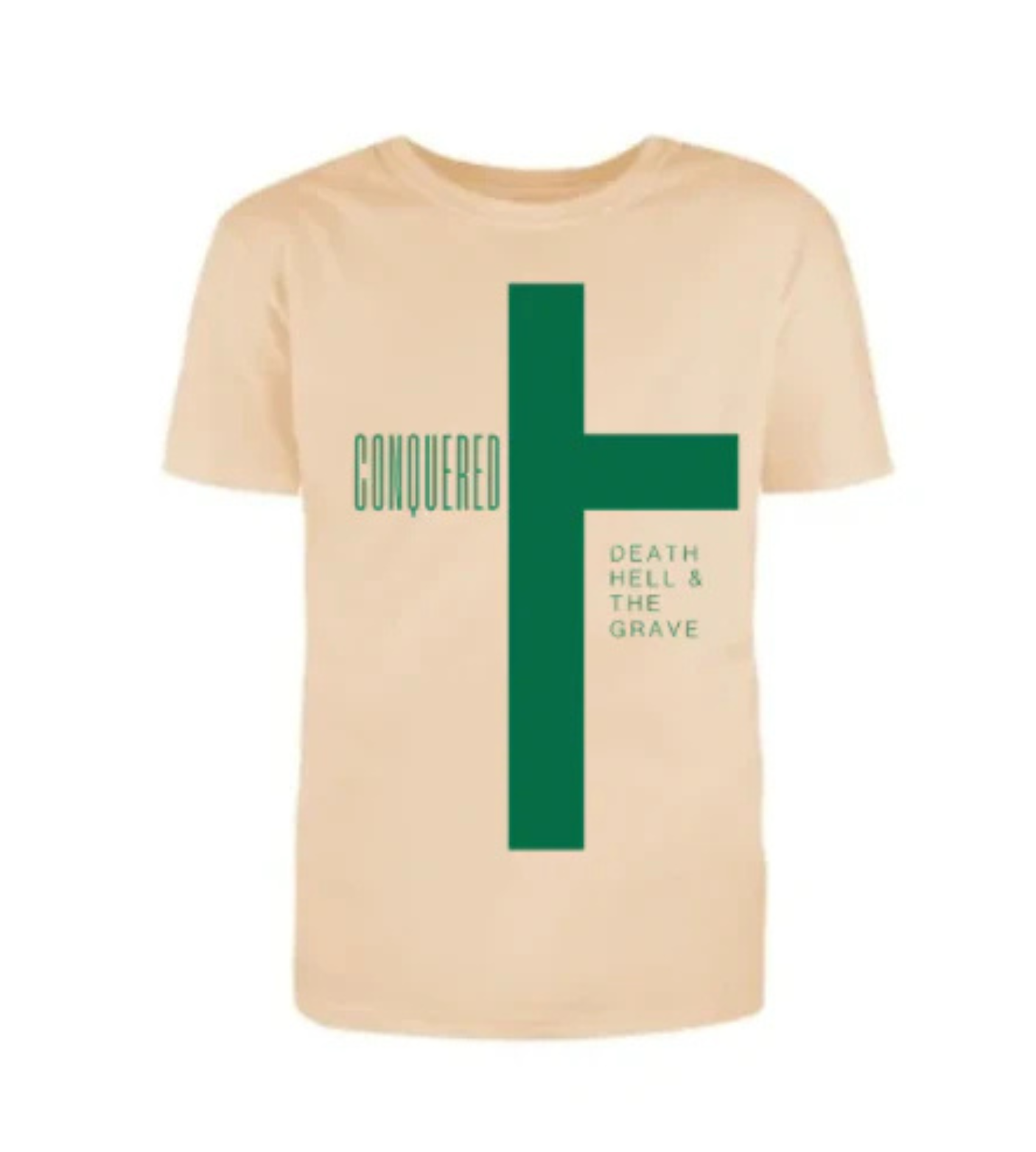 The Conquered Cross t-shirt features a bold design that declares victory over death, hell, and the grave. The large green cross dominates the front of the shirt, with the word "CONQUERED" emblazoned on the left side. On the right side of the cross, the phrase "DEATH HELL & THE GRAVE" serves as a reminder of the ultimate triumph of good over evil.