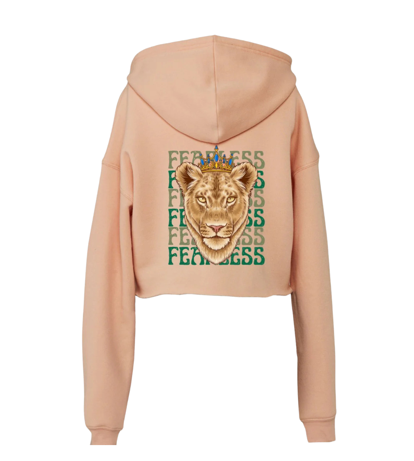 Unleash your inner strength and confidence with our Fearless Lioness Cropped Hoodie. This stunning peach-colored hoodie features a bold graphic of a lioness's face adorned with a crown, surrounded by the empowering word "FEARLESS" in green letters. Made from high-quality materials, this cropped hoodie is perfect for making a statement and showing off your fearless attitude.